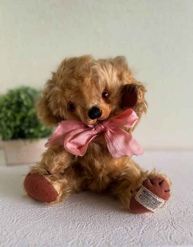 ショップ久々登場!!「REGD」チーキー!!がついにやってきました!! 右足ポーには1957年~'60年代初期に使用された「REGD DESIGN」という記述のある、 「MERRYTHOUGHT IRONBRIDGE, SHROPS MADE IN ENGLAND REGD DESIGN」と印刷された布タグがキレイに残ってます♡ 1957~60年初期に使用されていたタグ!!貴重なタグ付きのチーキーちゃんです♡ さらにさらにオリジナルリボンですよ☆ コレクターやチーキー付きにはたまりません♡ サイズは約27㎝の大人気サイズです☆ この穏やかな可愛らしい表情が、自然と周りを笑顔にしてくれますね! いっぱい可愛がっていただける方を大募集中っ!! またいつご紹介できるか分かりませんので、この表情にピン!と来られた方は、 このチャンスにぜひお迎えくださいね ☆ 手にした方の幸せを願いながら誕生したテディベア☆ テディベアの周りにあふれる幸せと笑顔をあなたの元へ☆ 小さなお店からあなたの元へ 心を込め届けていきたいと思っています♡