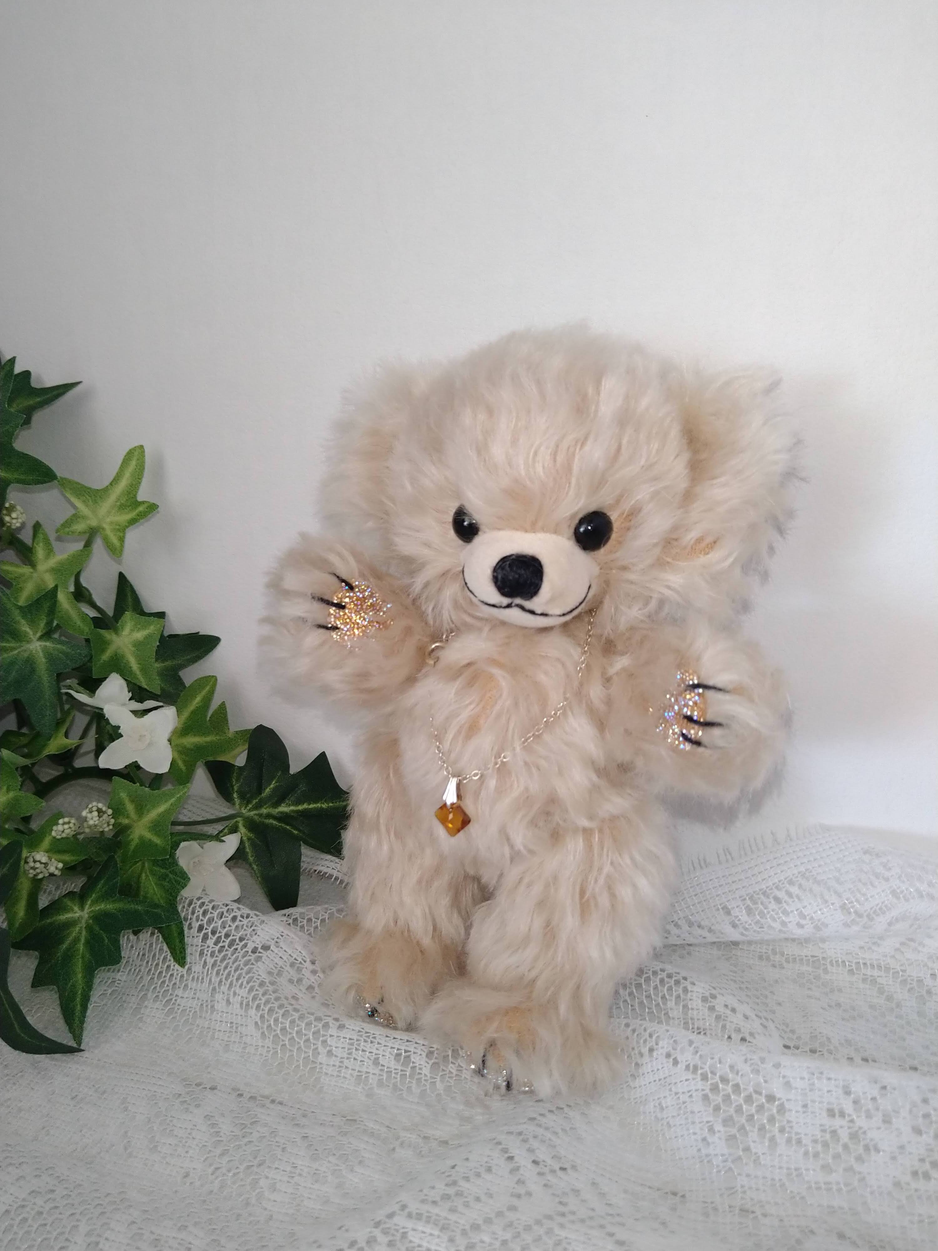 柔らかなブロンドのモヘアに首からは、トパーズをイメージしたスワロフスキーのペンダント!!手足のパッドにも小さなスワロフスキーをちりばめられているので、キラキラ輝く素敵なベアです☆