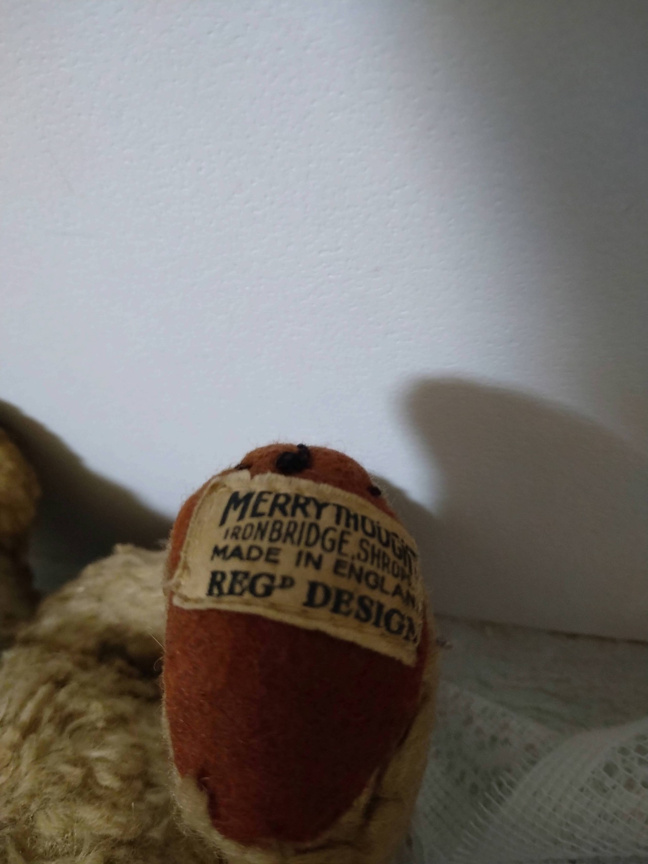 「MERRYTHOUGHT IRONBRIDGE, SHROPS MADE IN ENGLAND REGD DESIGN」と印刷された布タグがキレイに残ってます♡