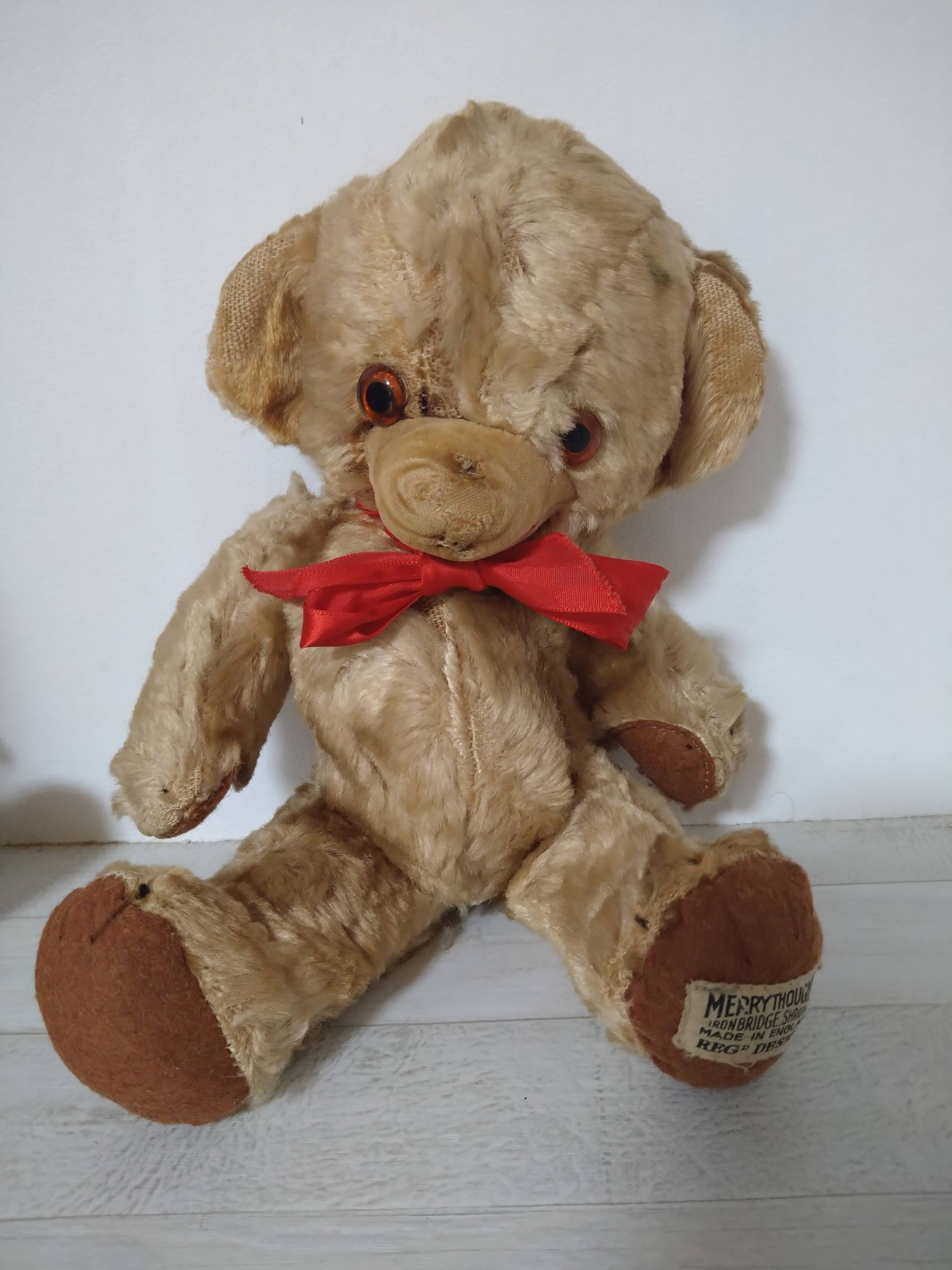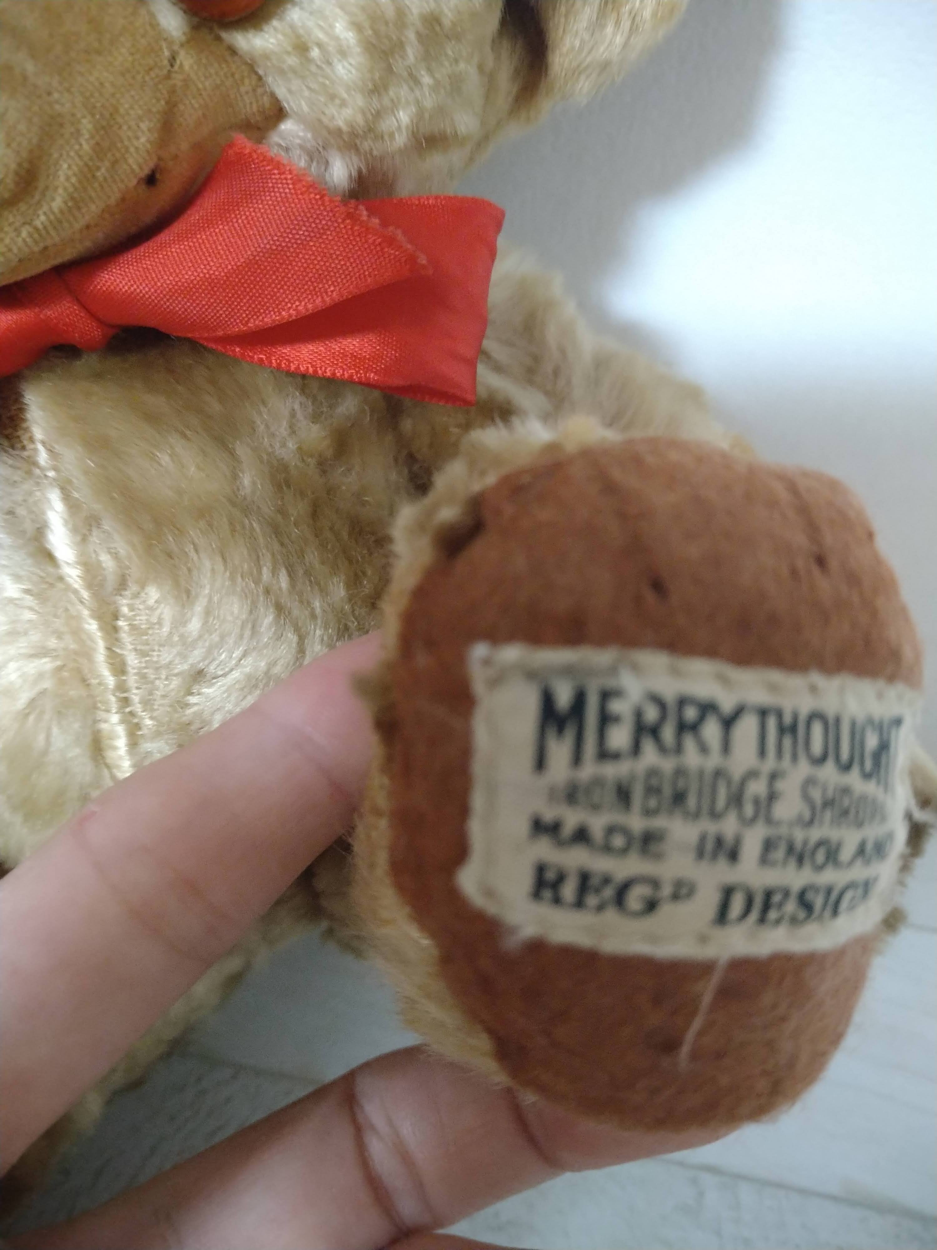 「MERRYTHOUGHT IRONBRIDGE, SHROPS MADE IN ENGLAND REGD DESIGN」と印刷された布タグがキレイに残ってます♡